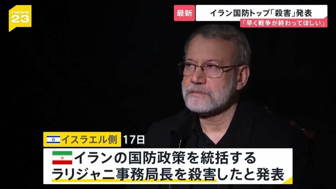 こうした中、イスラエル側は、イランの国防政策を統括する最高安全保障委員会のラリジャニ事務局長を殺害したと発表しました。