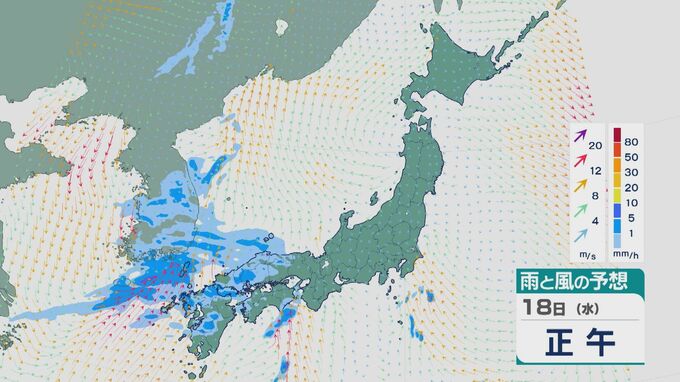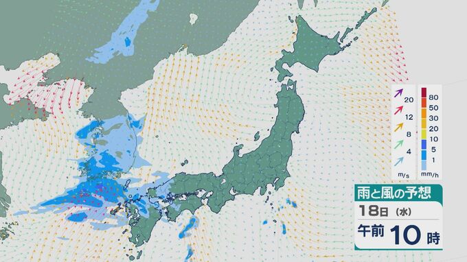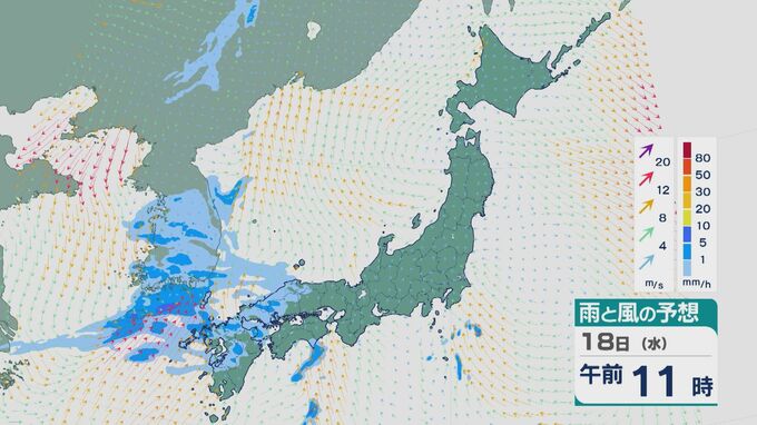 18日の雨と風の予想ですが、朝から九州では雨が降っています。次第に雨雲が東へと広がり、昼前からは中国・四国で雨が降り出しそうです。