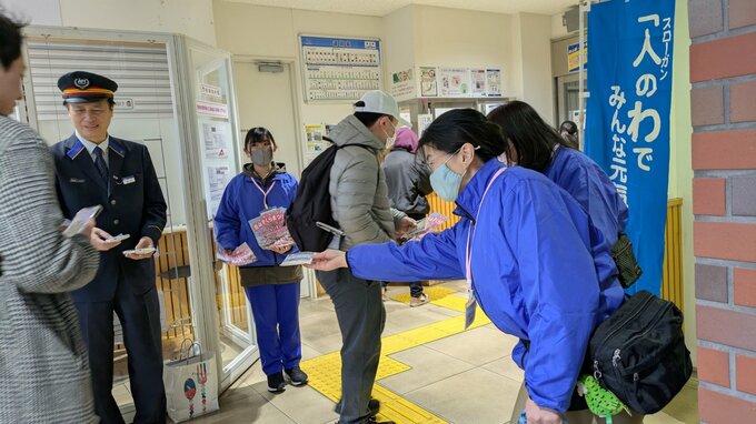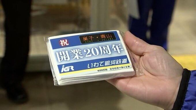青山駅では18日午前7時から、IGR関係者や地域住民らが開業を記念したデザインのポケットティッシュを配り、利用者に感謝の気持ちを伝えました。