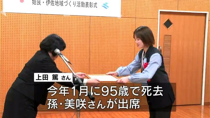 今回の表彰は、個性ある地域づくりへの取り組みが評価されました。しかし、上田さんは今年1月に95歳で亡くなり、表彰式には孫の美咲さんが出席しました。