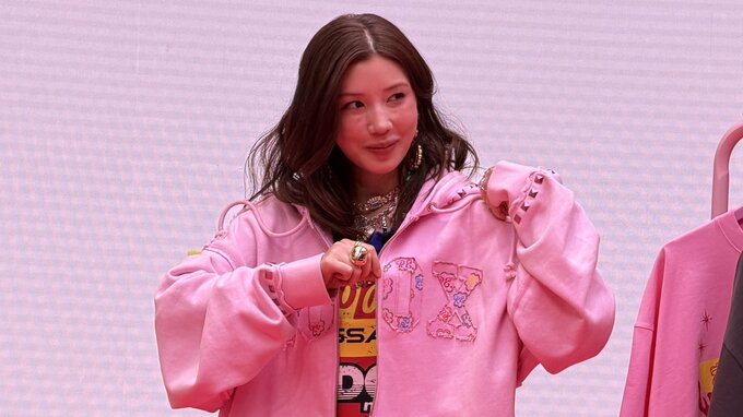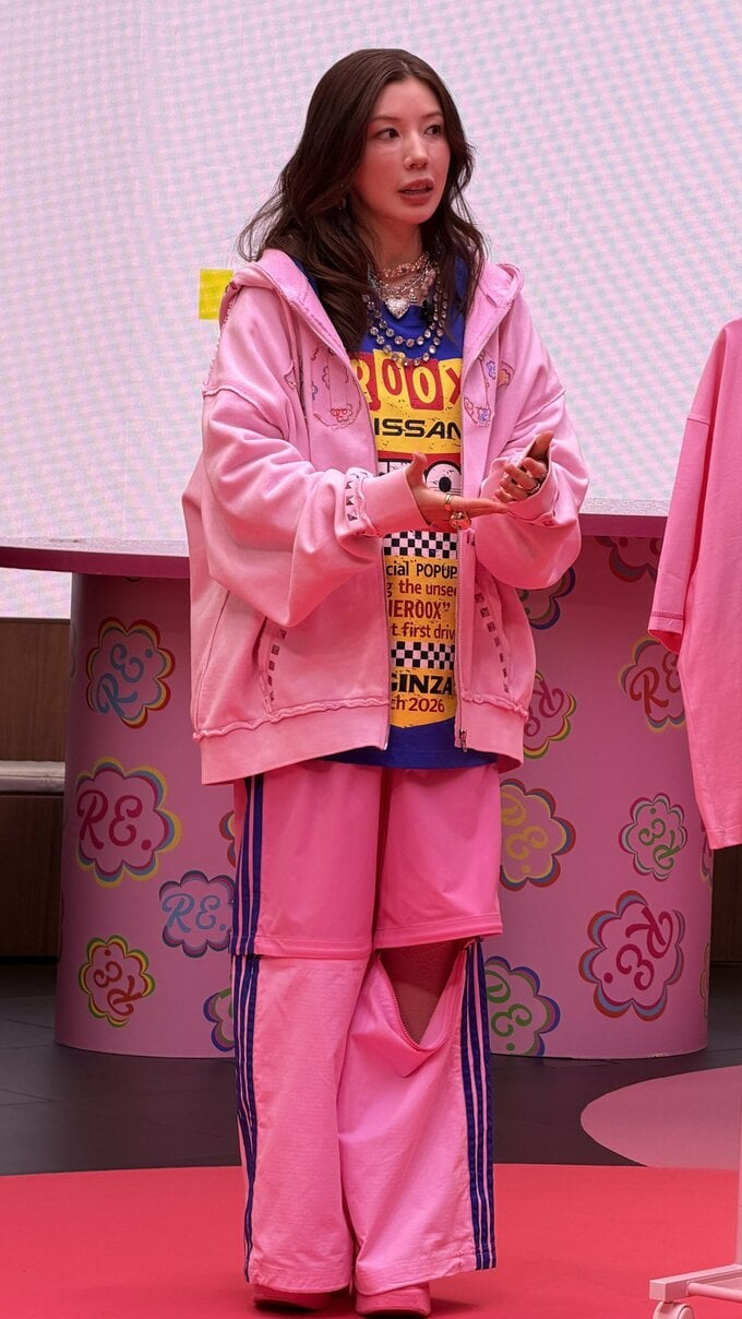仲さんは、今回のイベントグッズとして製作した青いTシャツにスタッズのついたピンクのパーカーを羽織り、ピンクのジャージーパンツ、さらにはピンクのヒールと、仲さんらしいド派手ファッションで登場。