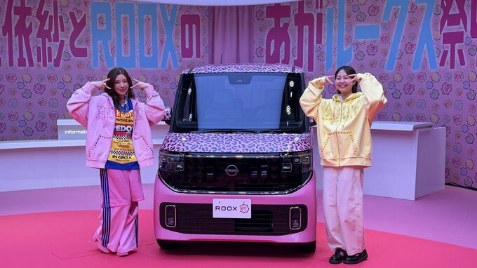 新型ルークスは、自身で色をカスタマイズできるのが大きな特徴。仲さんも今日のイベントのためにピンクのヒョウ柄と、単色ピンクのツートンのラッピングカーをデザインしたとのこと。このド派手な車体を前に、仲さんは〝一応、気を遣いました皆様に。実質一色なので、皆さんが乗りやすいかなって。一応配慮したカラーです〟と満足気。