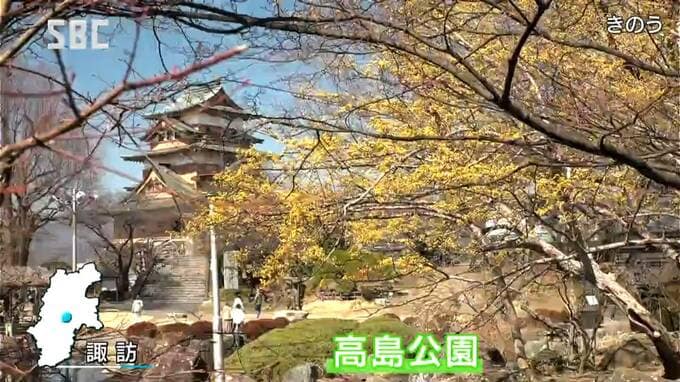 諏訪市の高島公園では、この時期に花を咲かせるサンシュユの木が植えられていて市民に親しまれています。