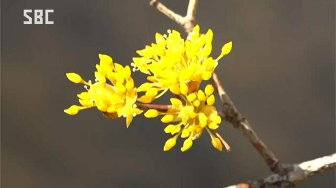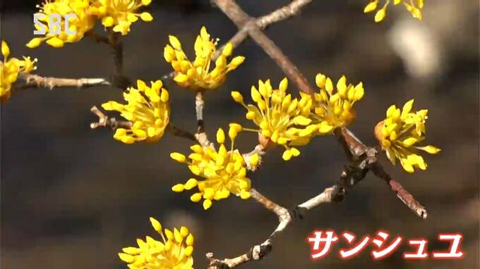 諏訪市に春の訪れを告げるサンシュユの花が見ごろを迎えています。