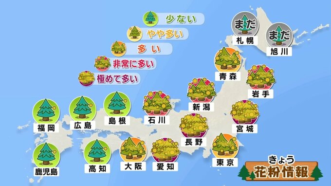 きょうは西日本では花粉は少ない予想ですが、東日本と東北は非常に多いか、極めて多い予想です。雲に覆われていても花粉は大量に飛散するのでお気をつけください。