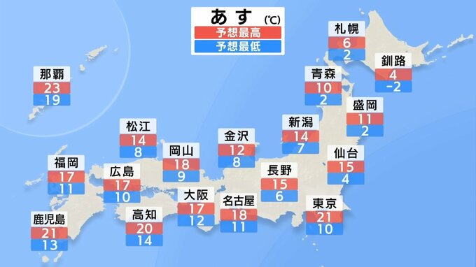 あすは低気圧が陸地から離れて行くので、次第に天気は回復するでしょう。雨は朝まで残る所もありますが、日中は晴れて日差しに後押しされ、気温はグングン上がりそうです。全国的にきょうより高くなる所が多く、東京は21℃まで上がって4月下旬並みの陽気になるでしょう。一方、一時的に冬型の気圧配置になる北海道や東北北部では雪の降る所がありそうです。