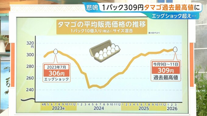 2023年7月の“エッグショック”時の306円を超え、過去最高値を更新しました。