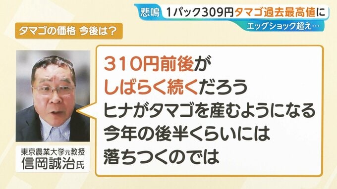 「310円前後がしばらく続くだろう。ヒナがタマゴを産むようになる今年の後半くらいには、落ち着くのではないか」と話しています。