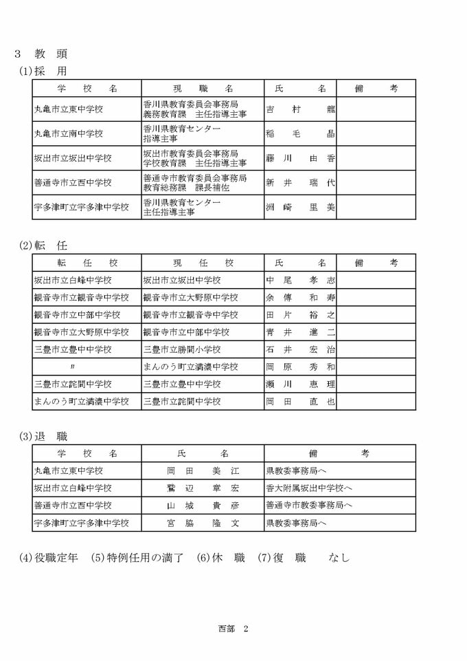 【2026年4月】香川県教職員人事異動「あの先生は、どこへ?」西部中学校(丸亀市・坂出市・善通寺市・観音寺市・三豊市・綾歌郡・仲多度郡)【画像一覧掲載】 RSK山陽放送 2026年3月19日(木) 15:10 国内 教頭 《画像》 【西部小学校】【東部小学校】【西部中学校】【東部中学校】【県立教員・事務職員】