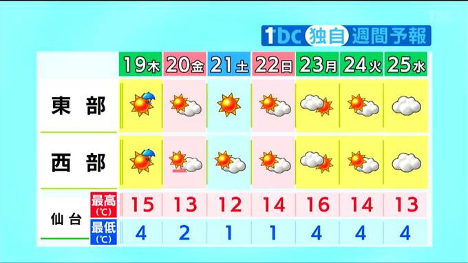 最低気温は、19日朝より5℃前後高いでしょう。最高気温は、仙台で15℃など4月中旬並みまで上がり、スギ花粉が、きわめて多く飛ぶおそれがあります。