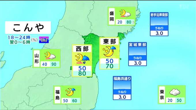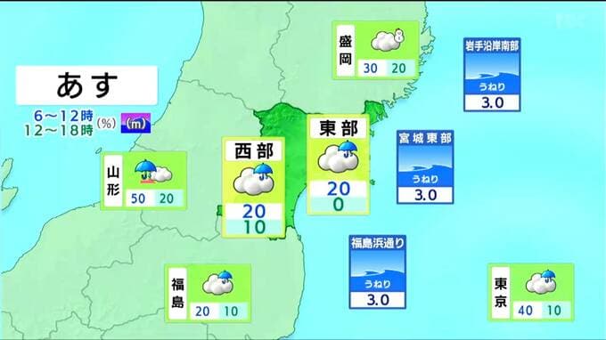明け方まで雨が降りますが、朝からは曇りや晴れとなるでしょう。北西の風が強まり、東部の陸上では日中、強風に注意が必要です。