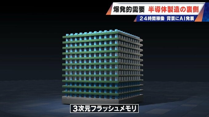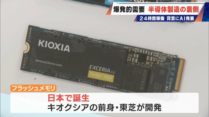 製造は、1メートルの10億分の1“ナノメートルレベル”。その数値が小さいほど処理速度は上がります。そもそもフラッシュメモリは、日本が作った技術。キオクシアの前身・東芝が開発しました。