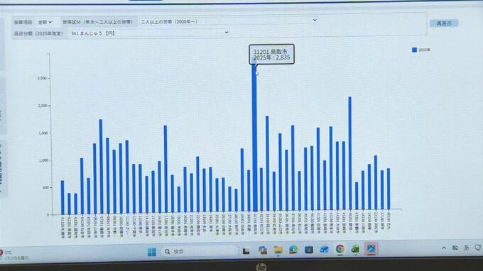 山陰の中で比べても、2人以上の世帯あたりの年間平均額は松江市が799円に対し、鳥取市は2835円です。
