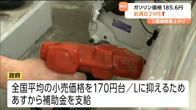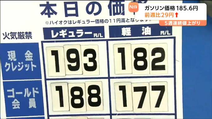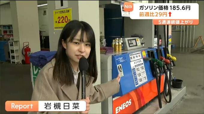 イラン情勢悪化の影響が続いています。16日現在の宮城県内のレギュラーガソリンの平均小売価格は185円60銭で前の週と比べて約29円高くなりました。値上がりは5週連続です。