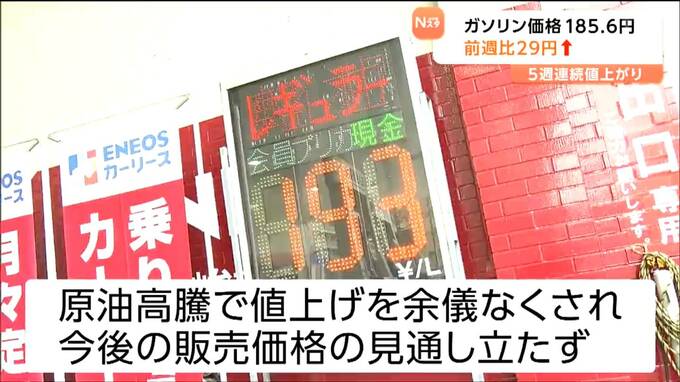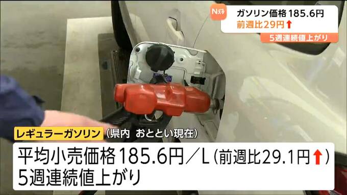 石油情報センターによりますと、宮城県内のレギュラーガソリンの平均小売価格は、16日現在、1ℓあたり185円60銭と前の週に比べ29円10銭値上がりしました。値上がりは5週連続です。