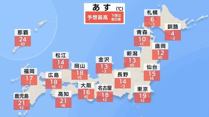 鹿児島:21℃ 那覇:24℃