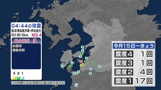 ここ数日、熊本県南部で地震が相次いでいます。今日(3月18日)も午前4時44分ごろに、水俣市と津奈木町で震度3を観測する地震がありました。
