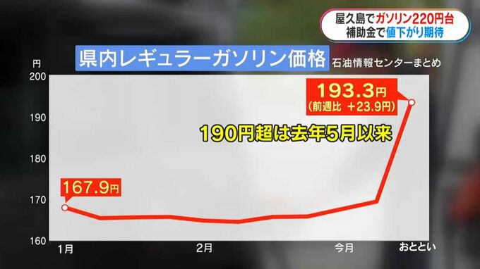 屋久島の一部のスタンドでは、あす19日以降、仕入れ価格に補助金が反映され、ガソリンの在庫が少ない店では、早ければ19日にも販売価格が下がる見込みだといいます。