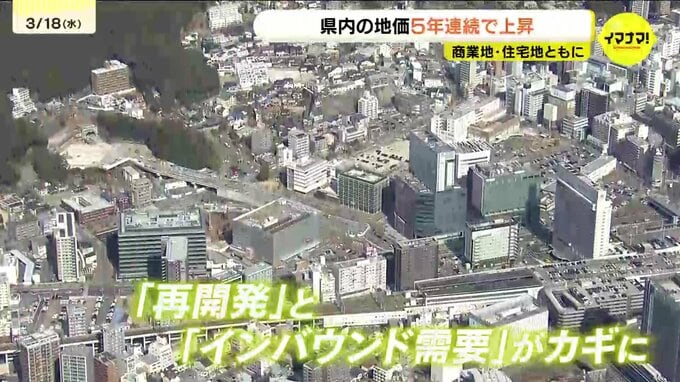 国土交通省が発表した「地価公示」。県内600あまりの地点で行われた調査によりますと、地価は県全体の平均で、住宅地が前の年と比べて1.5%上昇。商業地も3.1%上昇し、いずれも5年連続で上昇しました。