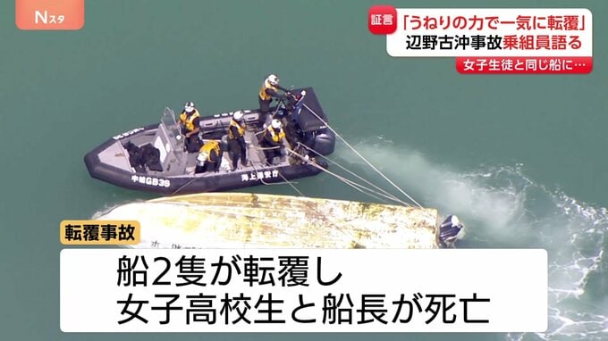 沖縄県名護市の沖合で船が転覆し2人が亡くなった事故で、船の乗組員がJNNの取材に応じ、事故当時の状況を語りました。女子生徒と乗船していた男性「船内に(水が)入るというよりは、うねりの力で一気に転覆です」…