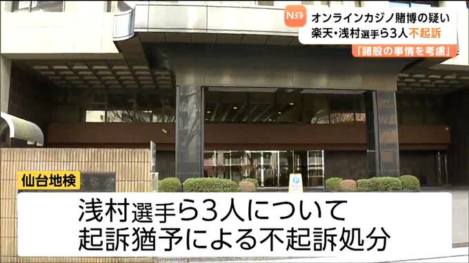 「球界の一員としての自覚を改めて強く求める」浅村選手らの不起訴処分を受け楽天野球団が公式コメント 東北放送 2026年3月18日(水) 19:32 国内 オンラインカジノで賭博をしたとして書類送検されていた楽天イーグルスの浅村栄斗選手ら球団関係者3人について、仙台地方検察庁は18日付けで起訴猶予による不起訴処分としました。 これを受け楽天野球団はコメントを発表しました。以下全文。