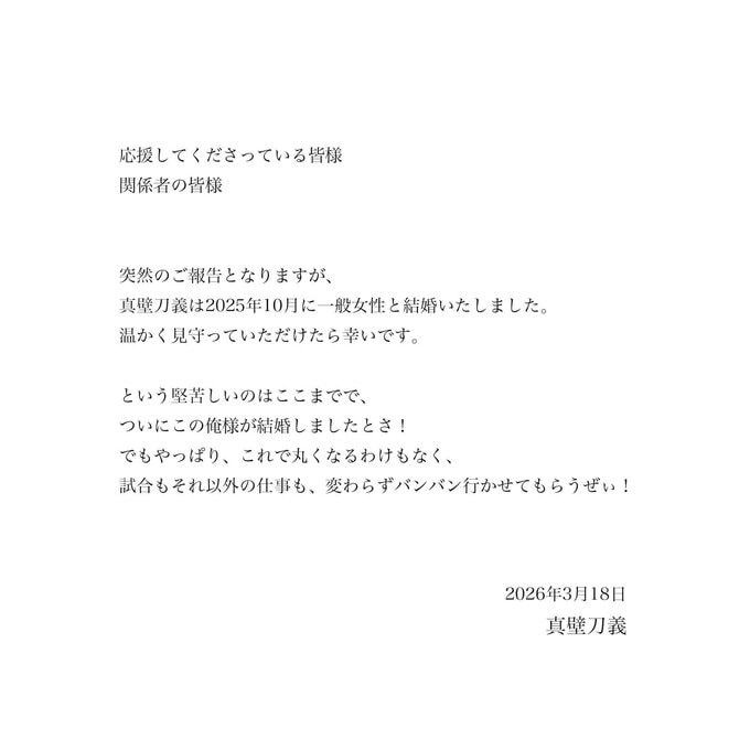 真壁刀義選手は「突然のご報告となりますが、 真壁刀義は2025年10月に一般女性と結婚いたしました。」と、報告。