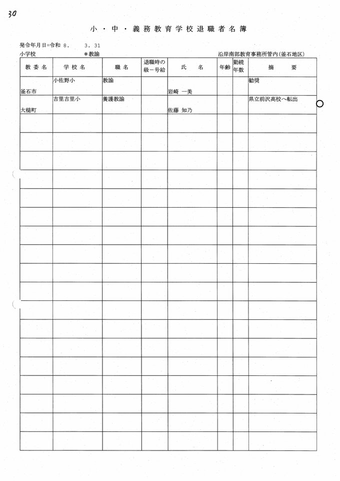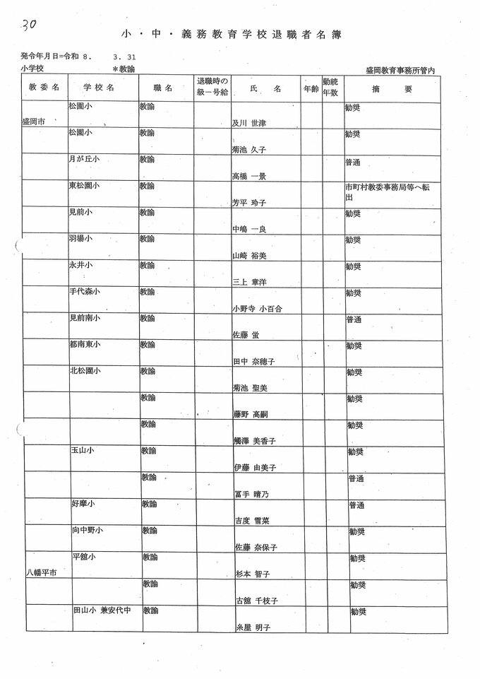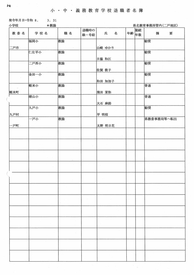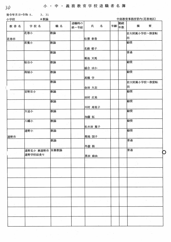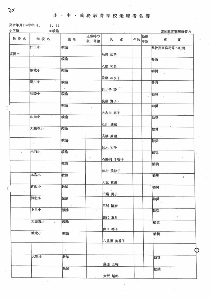 岩手県教職員人事異動2026年度 あの先生はどこへ行っちゃうの?(小学校、義務教育学校) IBC岩手放送 2026年3月20日(金) 06:00 国内 小学校【教諭 退職】 目次 【人事を見る】 校長 【人事を見る】 副校長 【人事を見る】 主幹教諭、指導教諭 【人事を見る】 盛岡、花巻、北上地区【教諭】 【人事を見る】 奥州、一関地区【教諭】 【人事を見る】 大船渡、釜石、宮古地区、義務教育学校【教諭】 【人事を見る】 久慈、二戸地区【教諭】 【人事を見る】 教諭の退職