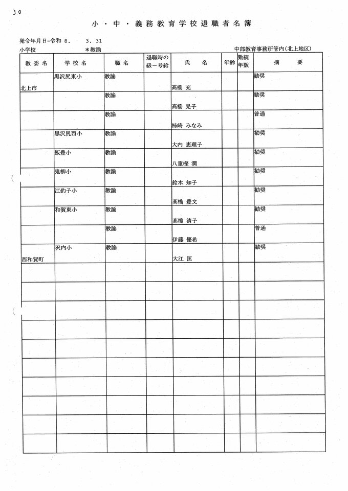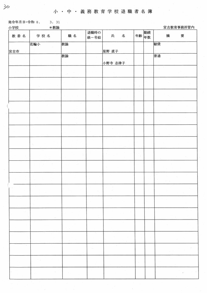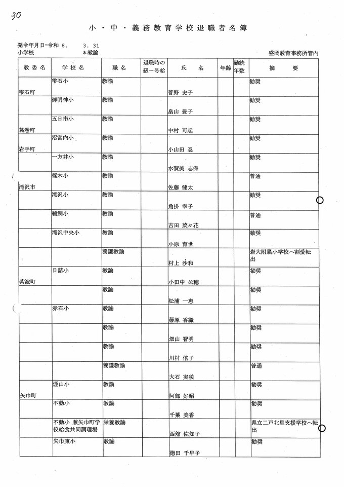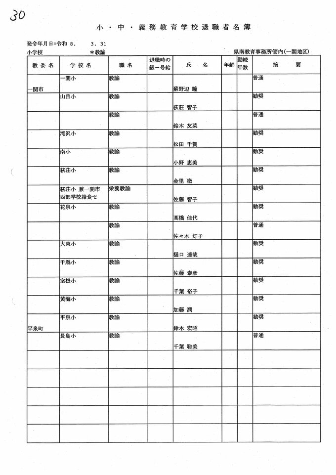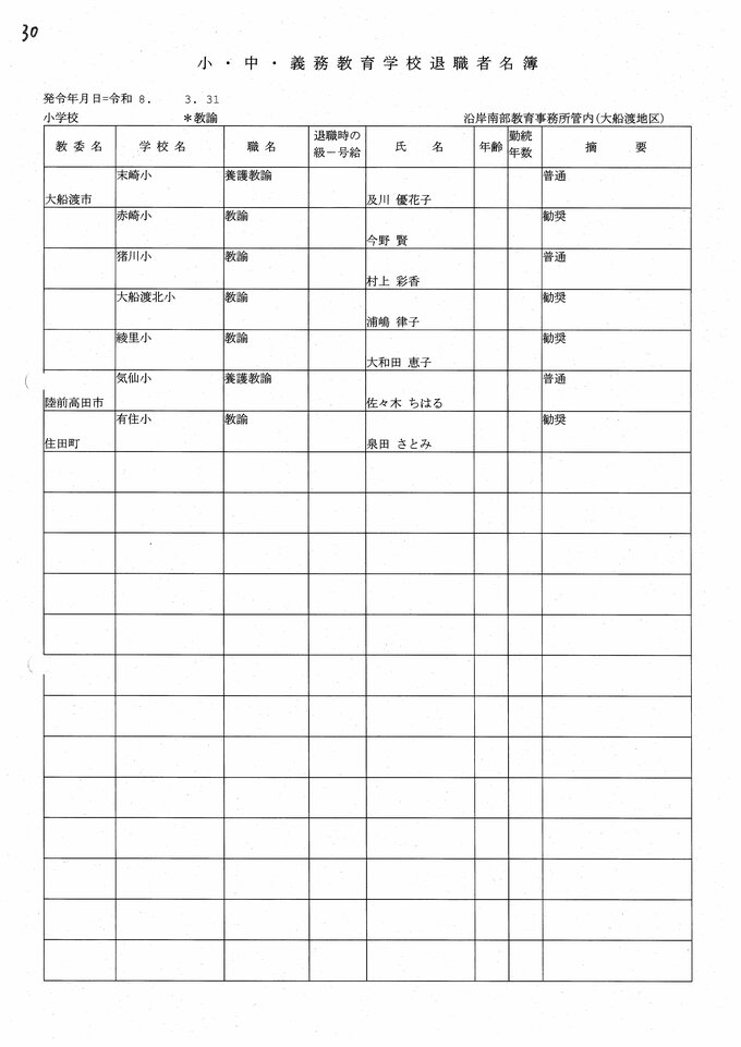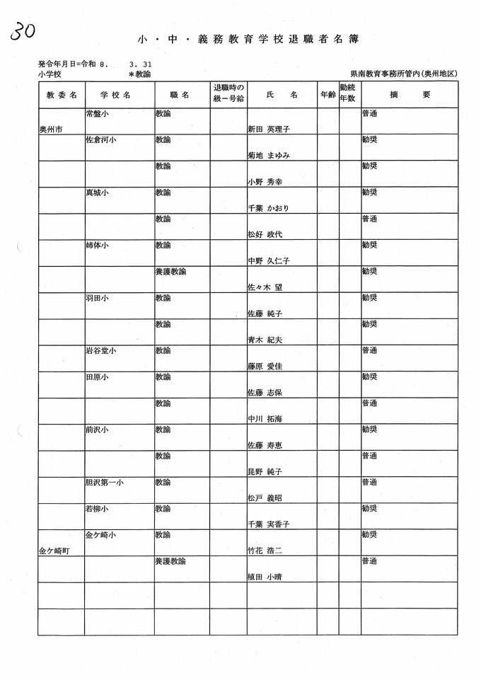 岩手県教職員人事異動2026年度 あの先生はどこへ行っちゃうの?(小学校、義務教育学校) IBC岩手放送 2026年3月20日(金) 06:00 国内 小学校【教諭 退職】 目次 【人事を見る】 校長 【人事を見る】 副校長 【人事を見る】 主幹教諭、指導教諭 【人事を見る】 盛岡、花巻、北上地区【教諭】 【人事を見る】 奥州、一関地区【教諭】 【人事を見る】 大船渡、釜石、宮古地区、義務教育学校【教諭】 【人事を見る】 久慈、二戸地区【教諭】 【人事を見る】 教諭の退職