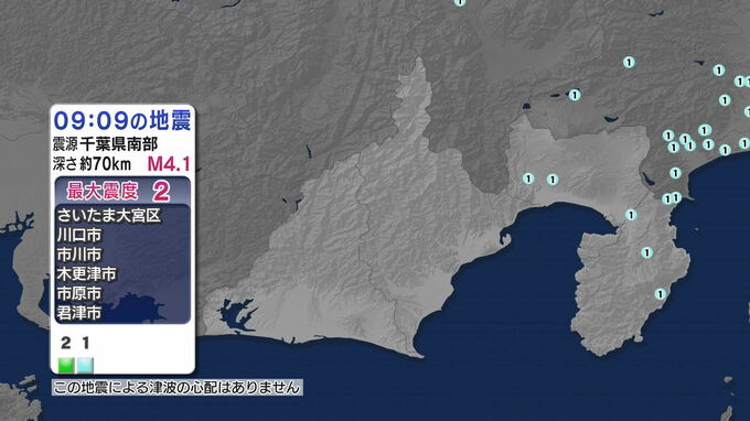 12月27日午前9時09分頃、千葉県南部を震源とする最大震度2の地震がありました。震源の深さは約70km、地震の規模を示すマグニチュード(M)はM4.1。この地震による津波の心配はありません。
