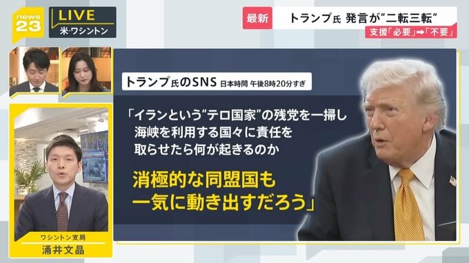 連日お伝えしているトランプ大統領の発言。中東地域に向けた各国からの艦船派遣について14日には、“期待を表明”していましたが、17日には、“もはや必要ない”と変わっています。