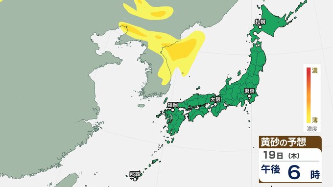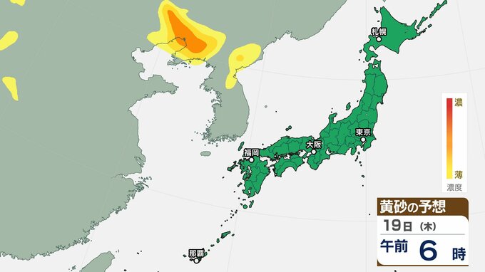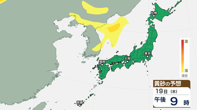 【黄砂情報】日本列島に黄砂が飛来か 20日(金・祝) 本州の広い範囲で影響の可能性 【気象庁黄砂シミュレーション/19日現在】 RSK山陽放送 2026年3月19日(木) 08:55 国内 天気 19日(木) 19日(木)~22日(日)黄砂シミュレーション画像 19日(木)~22日(日)黄砂シミュレーション画像