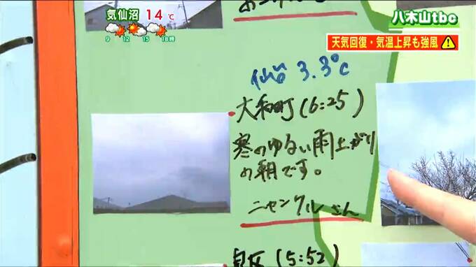 大和町の方からは「寒のゆるい雨上がりの朝」というコメントが届いています。19日朝の最低気温は仙台で3.3℃となり、3月下旬から4月中旬並みの暖かさとなりました。