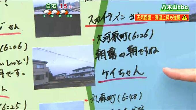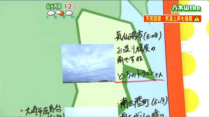 19日朝は雨上がりの曇り空となっている地域が多く、湿気が多くなっています。視聴者からは各地の様子が届いており、大河原町の方からは「朝霧の朝」というコメントが寄せられました。霧注意報は出ていないものの、湿気が多いため遠くの見通しが悪い場所があるかもしれません。