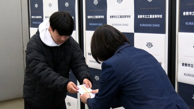 倉敷市の伊東香織市長が高校を訪れ式典が行われました。寄付金となる3万円は機械科有志の生徒たちがサイドテーブルなどを製作し販売した売り上げの中から用意したもので生徒から伊東市長に手渡されました。この基金は1979年に大山茂樹元市長が退職金の一部などを寄付したことがきっかけで設立され健やかな成長を応援する様々な事業に活用されています。