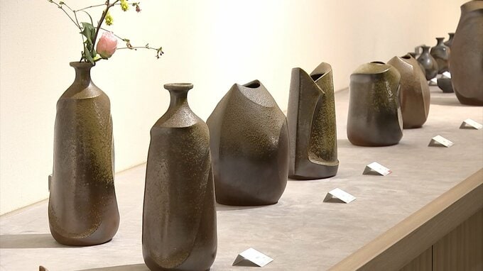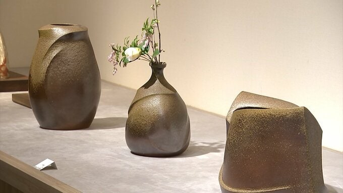 特徴的な曲線が目を引く「備前花器」日本伝統工芸中国展で特別賞「金重陶陽賞」を受賞した作品です。天満屋岡山店で開かれている陶芸家・伊勢崎創さんの陶展です。
