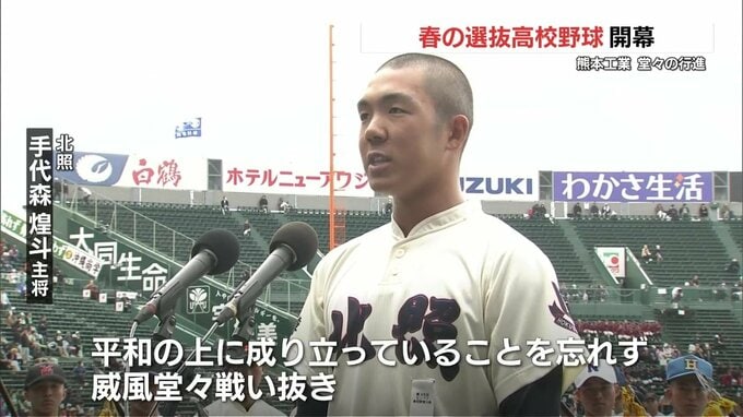 北照の手代森煌斗主将は「こうしてつながっていく私たちの夢が、平和の上に成り立っていることを忘れず、威風堂々戦い抜き、次の世代の夢となることを誓います」と宣誓しました。