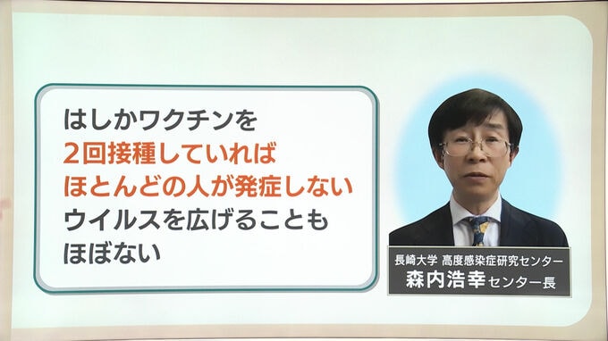 一方で、免疫を持っている人は感染リスクは低く、長崎大の森内教授は「(はしか)ワクチンを2回接種していればほとんどの人が発症しない。ウイルスを広げることもほぼない」ということです。
