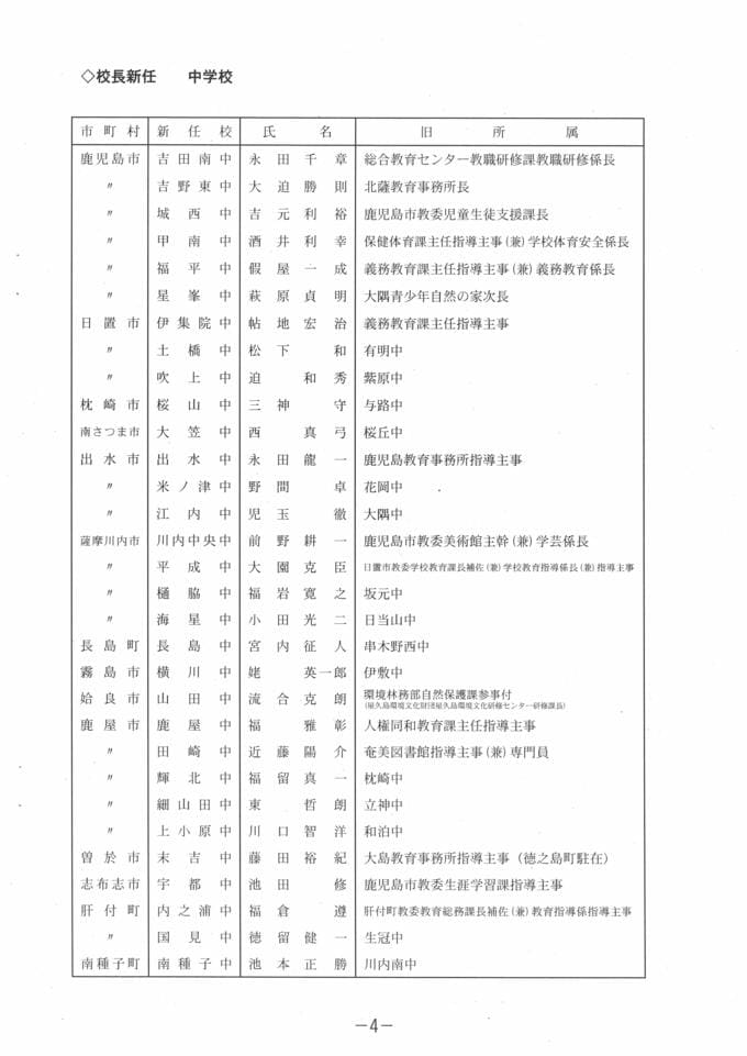 鹿児島県教職員 人事異動【小学校・中学校・義務教育学校】の【校長・教頭】新任、異動、退職「あの先生はどこへ」2026・令和8年名簿一覧 南日本放送 2026年3月19日(木) 17:10 国内 【校長新任 中学校】