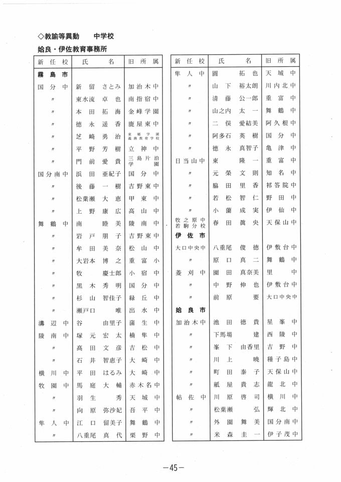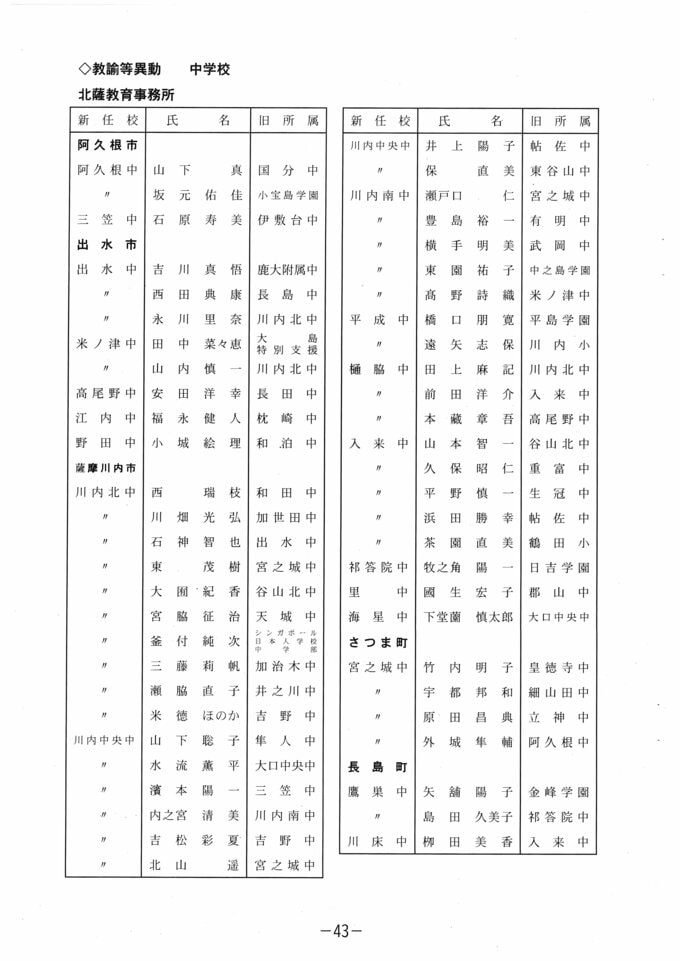 鹿児島県教職員 人事異動【小学校・中学校・義務教育学校】の【教諭・事務職員】全校一覧「あの先生はどこへ」2026・令和8年名簿 南日本放送 2026年3月19日(木) 17:12 国内 教諭等異動 中学校 北薩教育事務所(阿久根市、出水市、薩摩川内市、さつま町、長島町) 教諭等異動 中学校 姶良・伊佐教育事務所(霧島市、伊佐市、姶良市)
