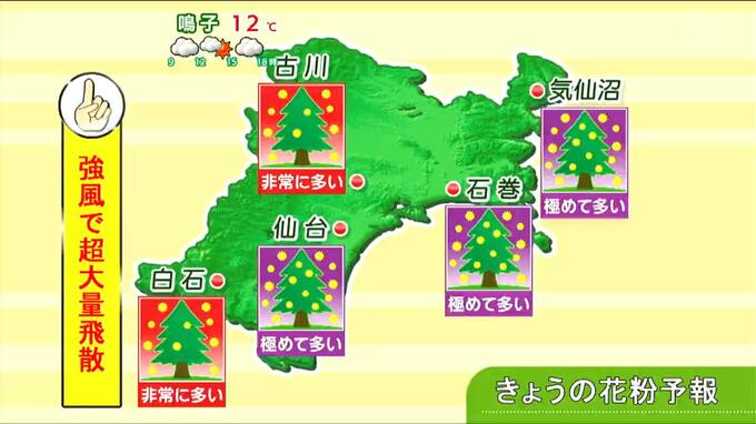 19日は雨上がりで気温が上昇し、さらに風も強まることから、花粉の飛散量は東部を中心に最も上のランク「極めて多い」と予想されています。この後、風が強まるにつれて症状がつらくなる方が増えてくるおそれがあります。外出の際にはマスクや眼鏡などの対策を徹底してください。