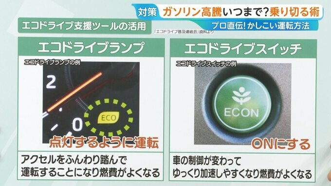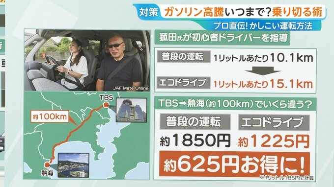 菰田氏が初心者ドライバーを指導したところ、普段の運転ではガソリン1Lあたり10.1km走行だったのが、エコドライブ実施で1Lあたり15.1kmに伸びました。