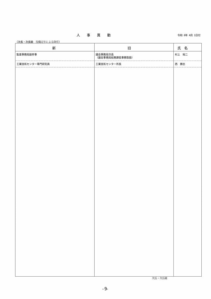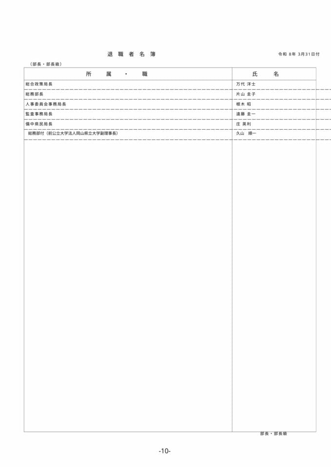【2026年4月】岡山県職員 第1次人事異動 部長・次長(昇任・配置換え)退職者など【画像一覧掲載】 RSK山陽放送 2026年3月19日(木) 17:39 国内 次長・次長級(役職定年による降任) 【画像一覧掲載】岡山県職員 第1次人事異動 部長・次長(昇任・配置換え)退職者など 退職者(部長・部長級) 【画像一覧掲載】岡山県職員 第1次人事異動 部長・次長(昇任・配置換え)退職者など