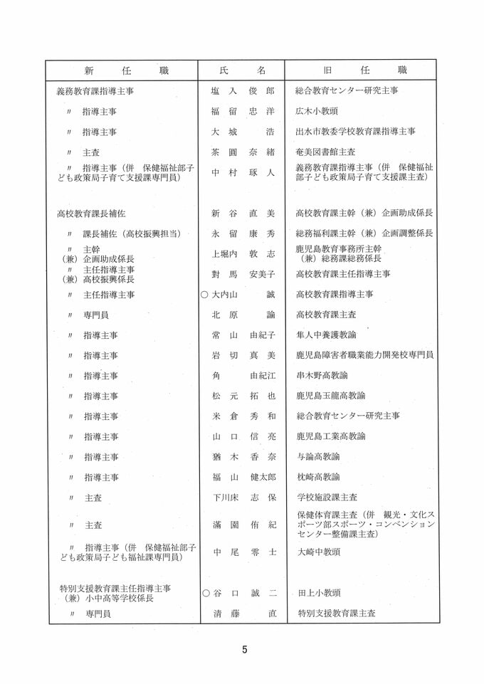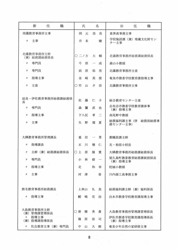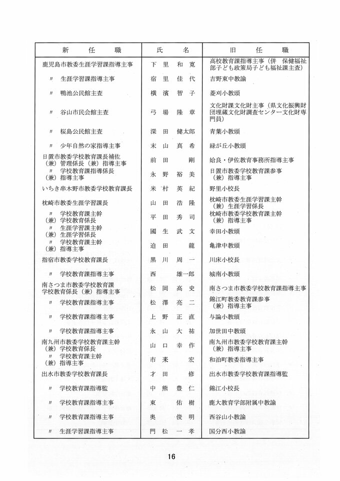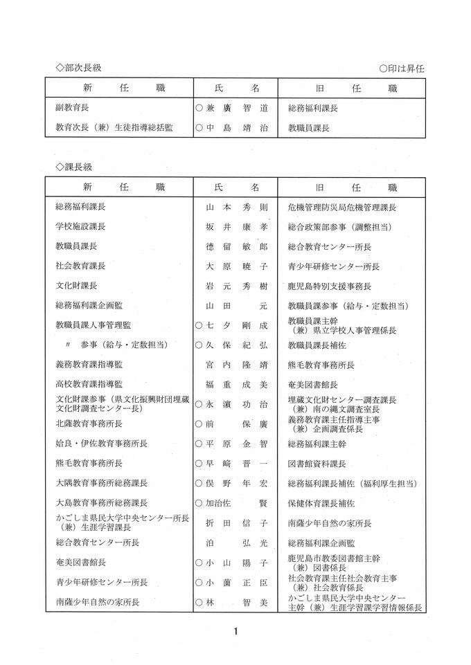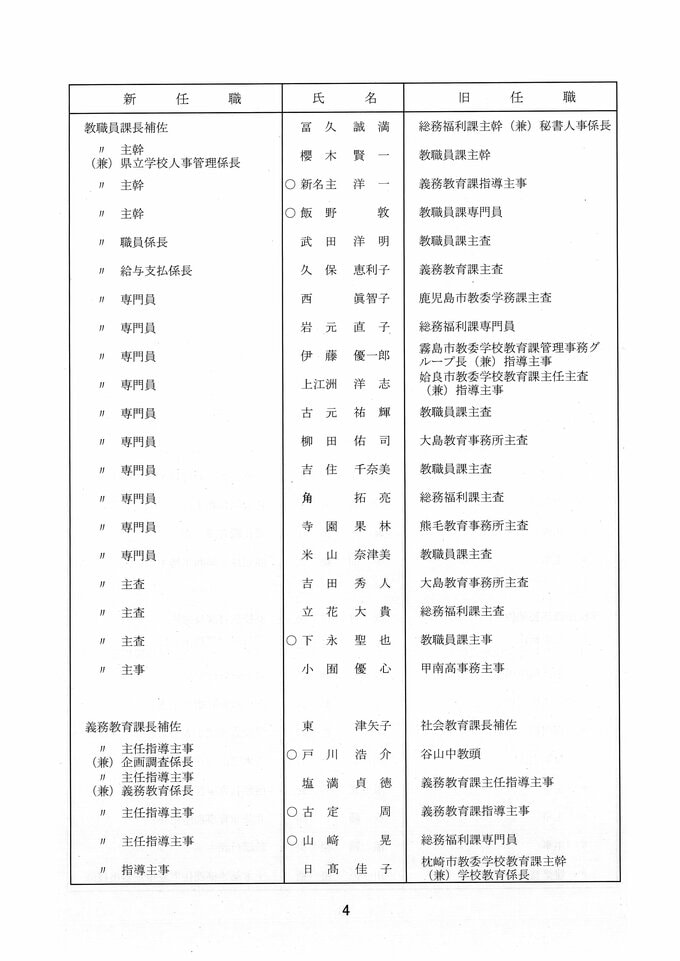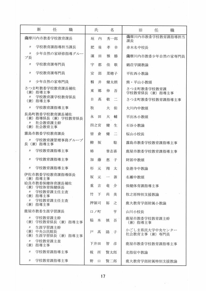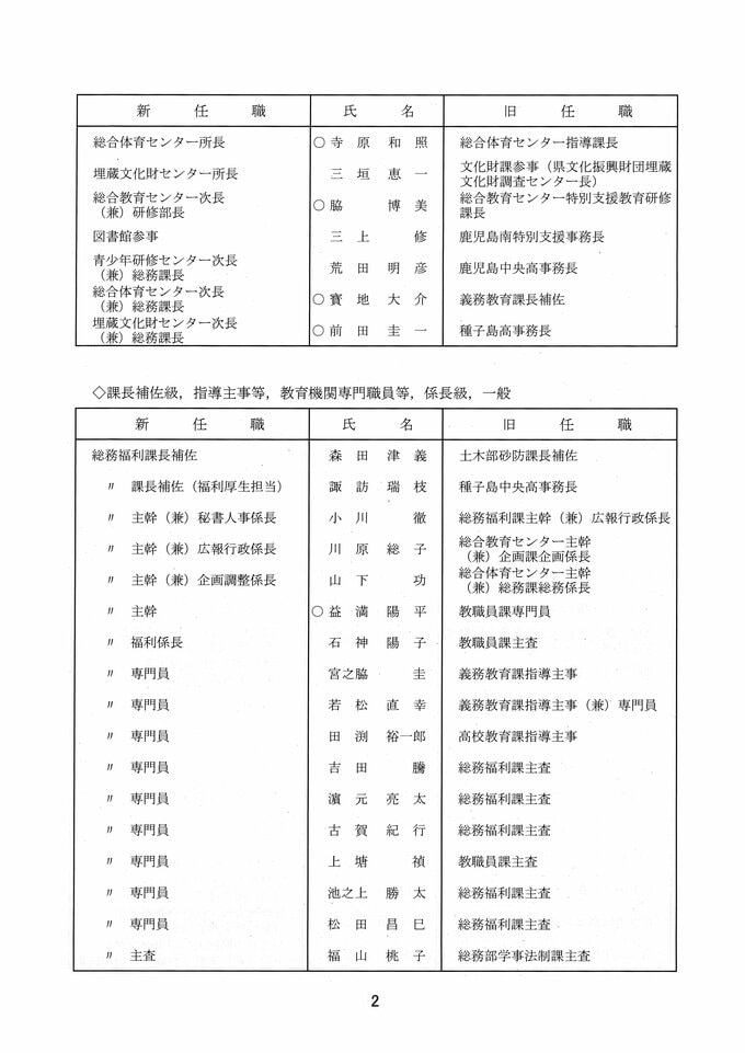 鹿児島県教職員人事異動2026 教育庁の異動一覧「あの先生はどこへ」県教育委員会の異動 令和8年 南日本放送 2026年3月19日(木) 17:11 国内 部次長級、課長級 課長級、課長補佐級、指導主事等、教育機関専門職員等、係長級、一般 知事部局等、国の機関等への転出、退職 市町村教育委員会関係