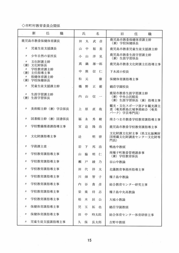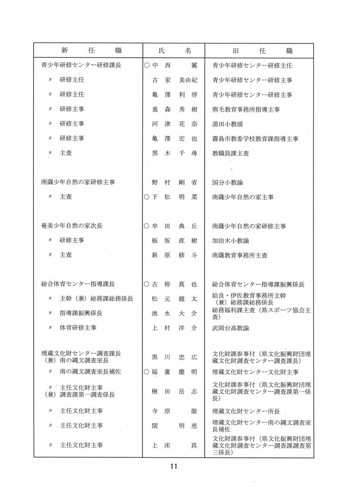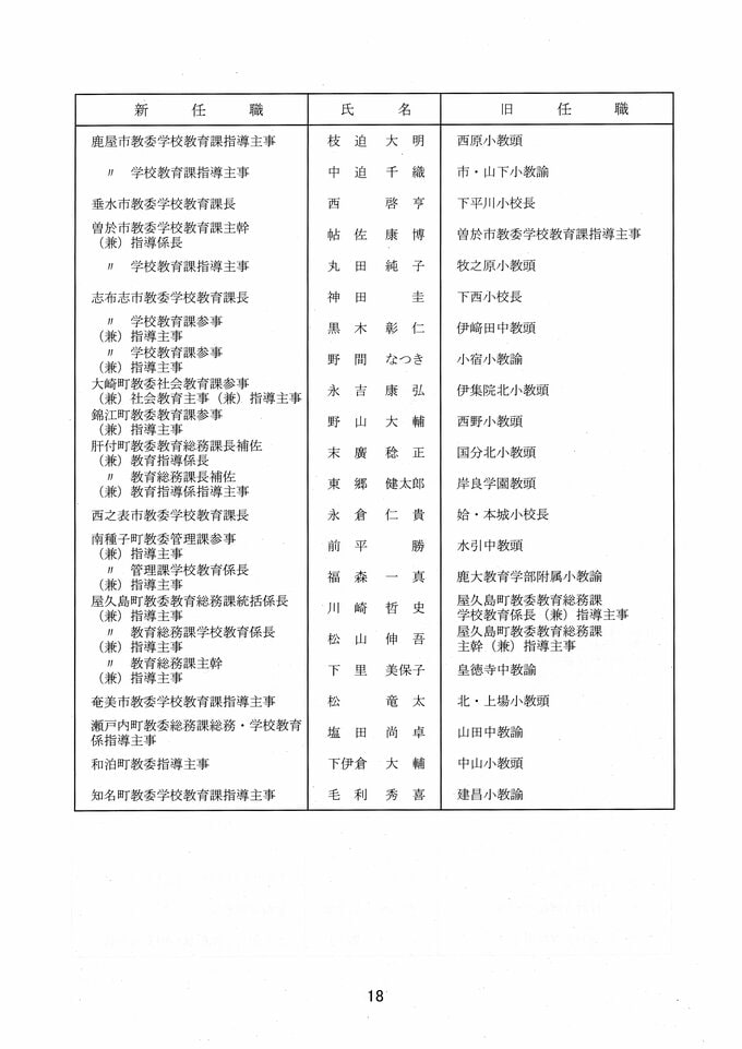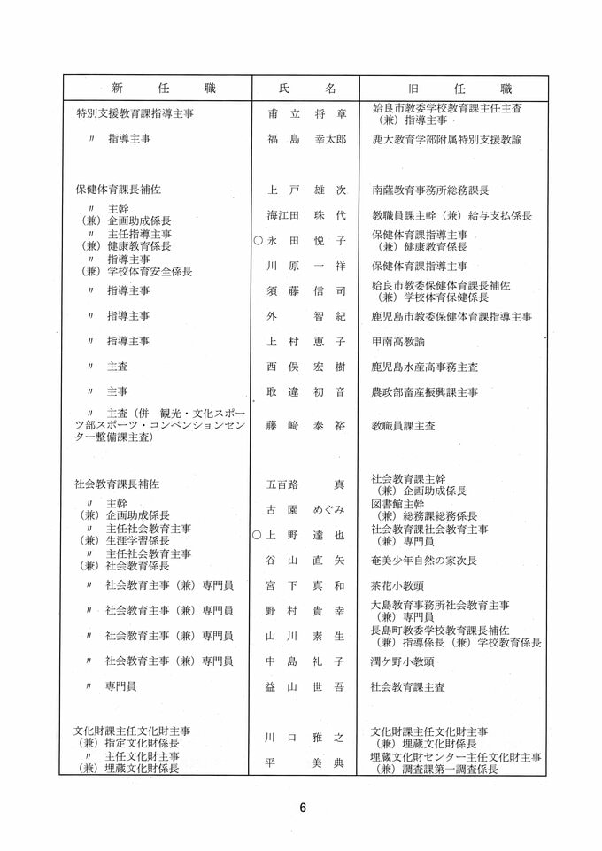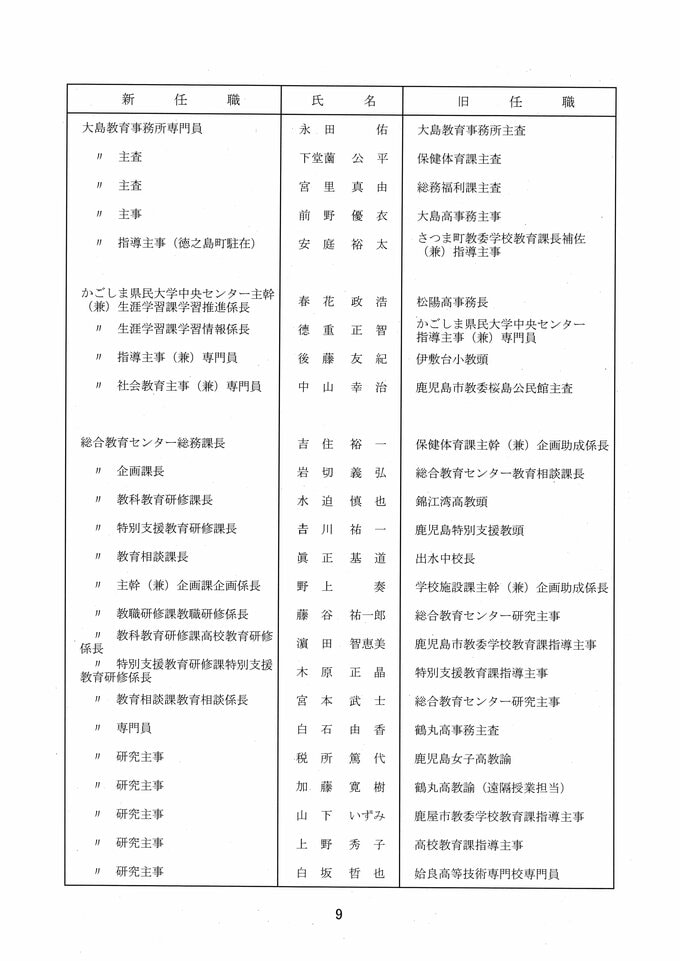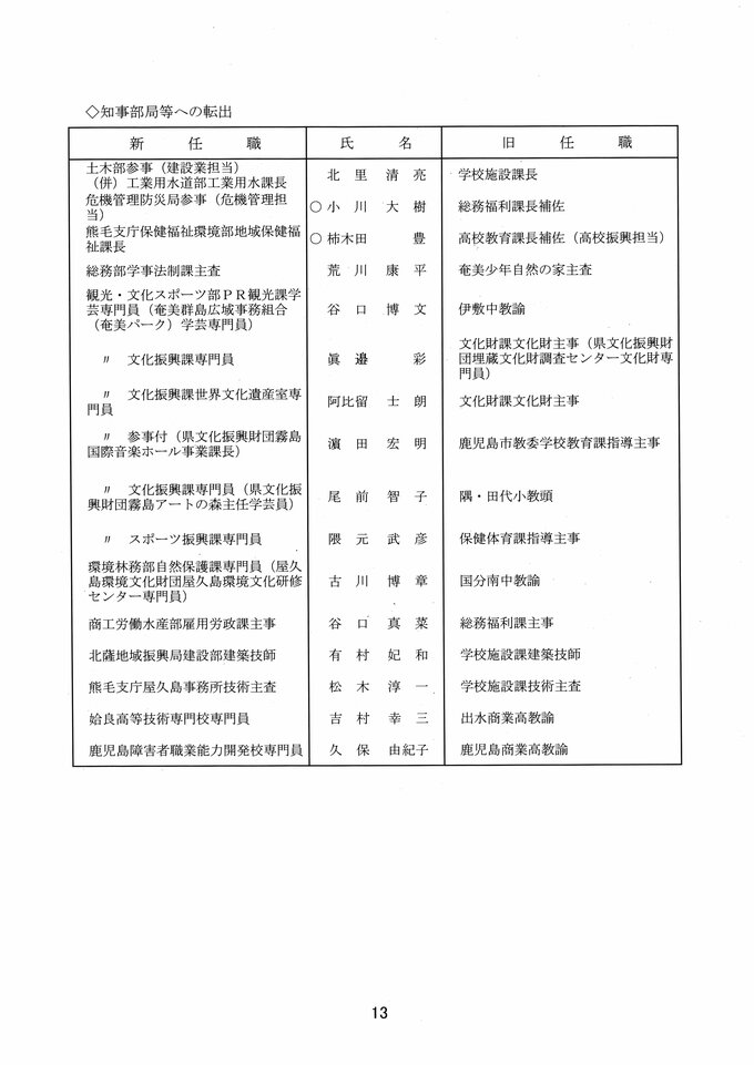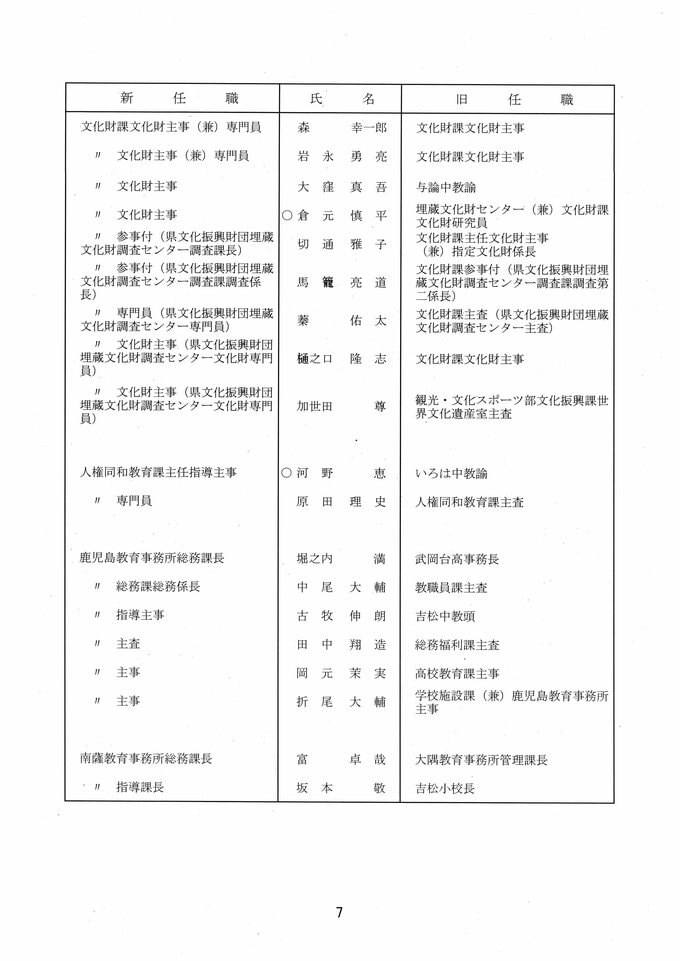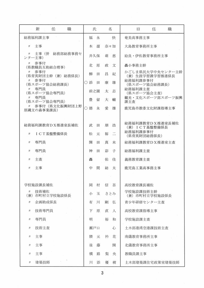 鹿児島県教職員人事異動2026 教育庁の異動一覧「あの先生はどこへ」県教育委員会の異動 令和8年 南日本放送 2026年3月19日(木) 17:11 国内 部次長級、課長級 課長級、課長補佐級、指導主事等、教育機関専門職員等、係長級、一般 知事部局等、国の機関等への転出、退職 市町村教育委員会関係