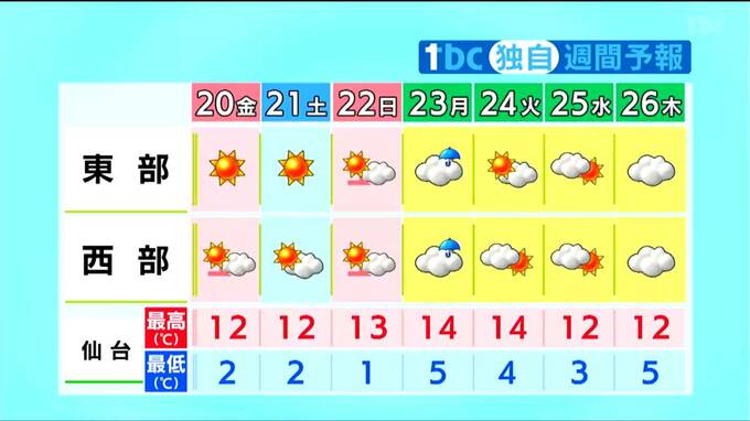 最低気温は19日朝より1℃から6℃低く、農作物に霜が降りるおそれがあります。最高気温は、沿岸では平年並み、内陸では、4月上旬から中旬並みでしょう。
