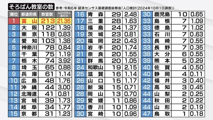 政府の統計によりますと、県内のそろばん教室の数は213教室と、人口が桁違いに多い東京都や大阪府を100教室近く引き離し全国1位。