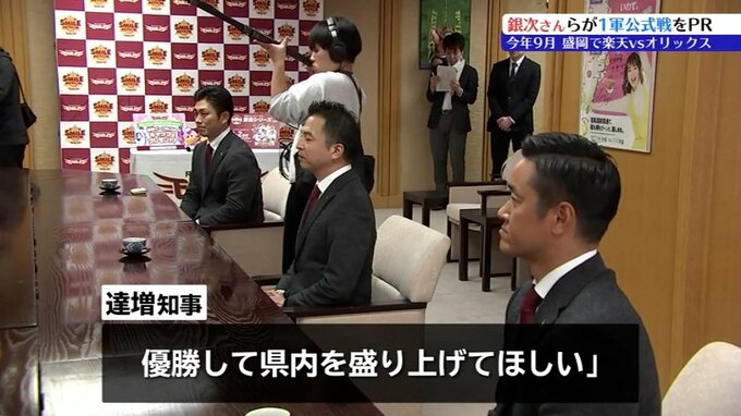 19日は楽天野球団の森井誠之社長をはじめ、楽天イーグルス・アンバサダーを務める銀次さんと岡島豪郎さんが県庁を訪れ、達増知事に盛岡市での1軍公式戦の開催を伝えました。