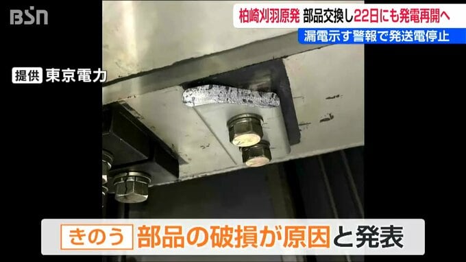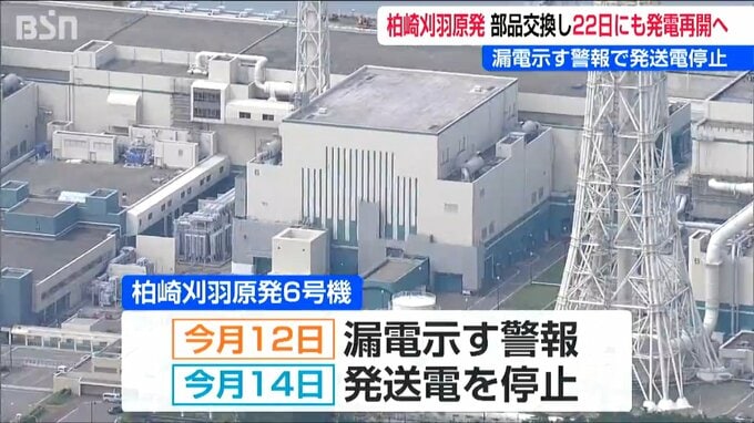 柏崎刈羽原発6号機で漏電を示す警報が作動し発送電を停止していた問題で、東京電力は、部品を交換し22日にも発電を再開すると発表しました。