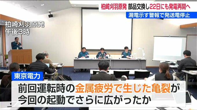 東電は19日の会見で、部品の破損は2012年3月までの運転で金属疲労による亀裂が生じていたことに加え、今回の起動の中でさらに亀裂が広がったことが原因とみられると説明。