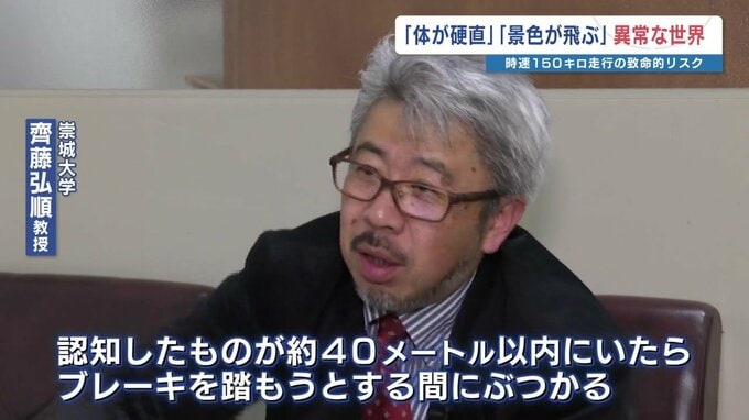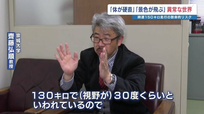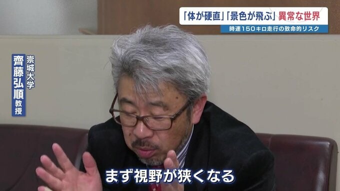 崇城大学 齊藤弘順教授「150キロという速度になると、普通の人はなかなか経験しない。まず視野が狭くなる。ハンドルを強く握りがちになり体も固くなる」